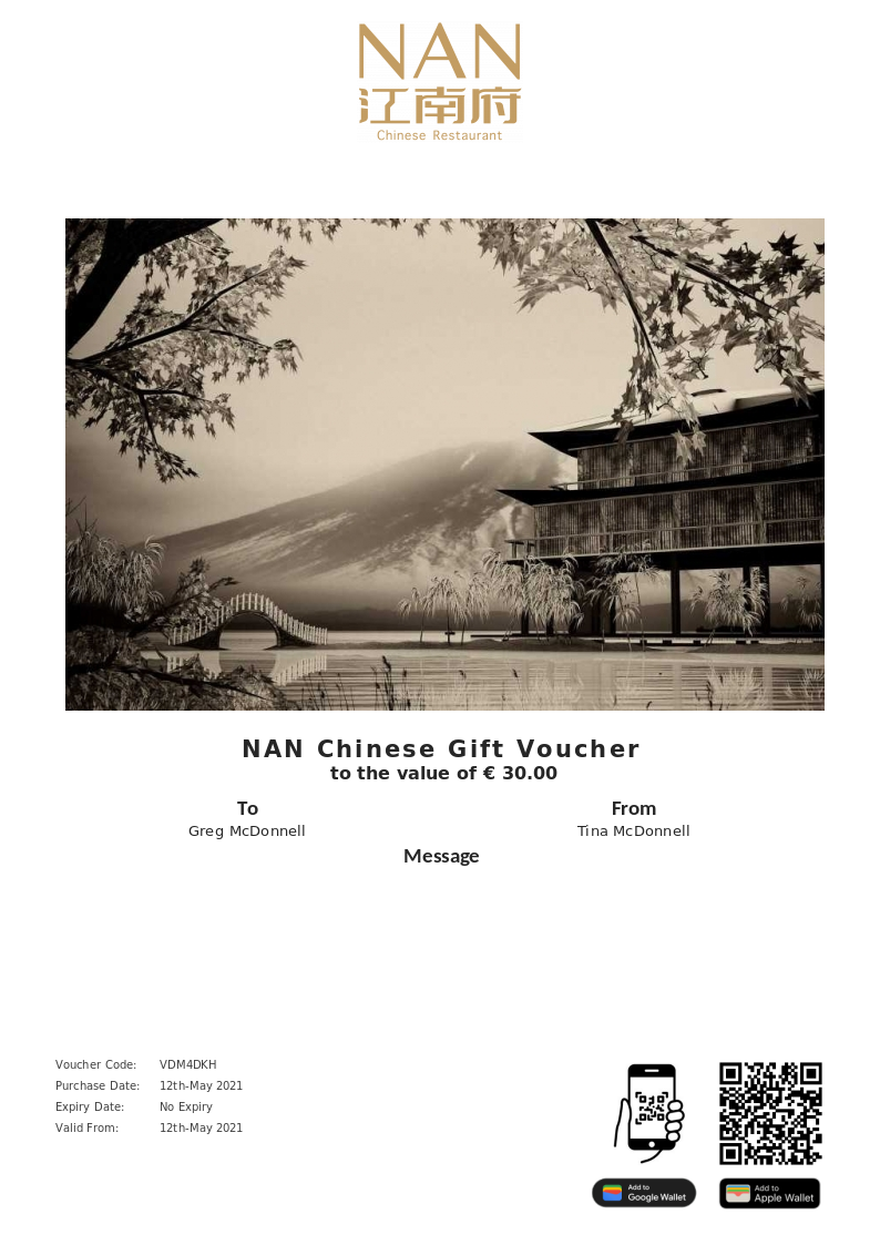 NAN Chinese allows you to purchase instantly printable gift vouchers, special offers and tickets using the Voucher Connect platform.